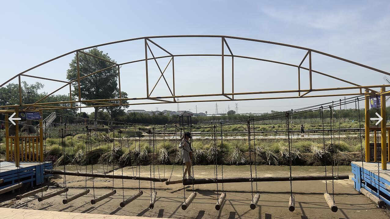 园区内的木桥主要为前来游玩的中小员工们提供,桥身木条仅由上方连接桥架的悬挂铁链构成,下方并不固定,考验着过桥人的身体协调与运动能力。老同志们从不认输,矫健的身姿在桥上显得尤为瞩目,木桥看似晃晃悠悠,老同志的步伐却依旧稳稳当当,这无不展示着老同志们健康快乐的时代风采、老有所乐的精神面貌以及积极向上、永不服输的阳光心态。