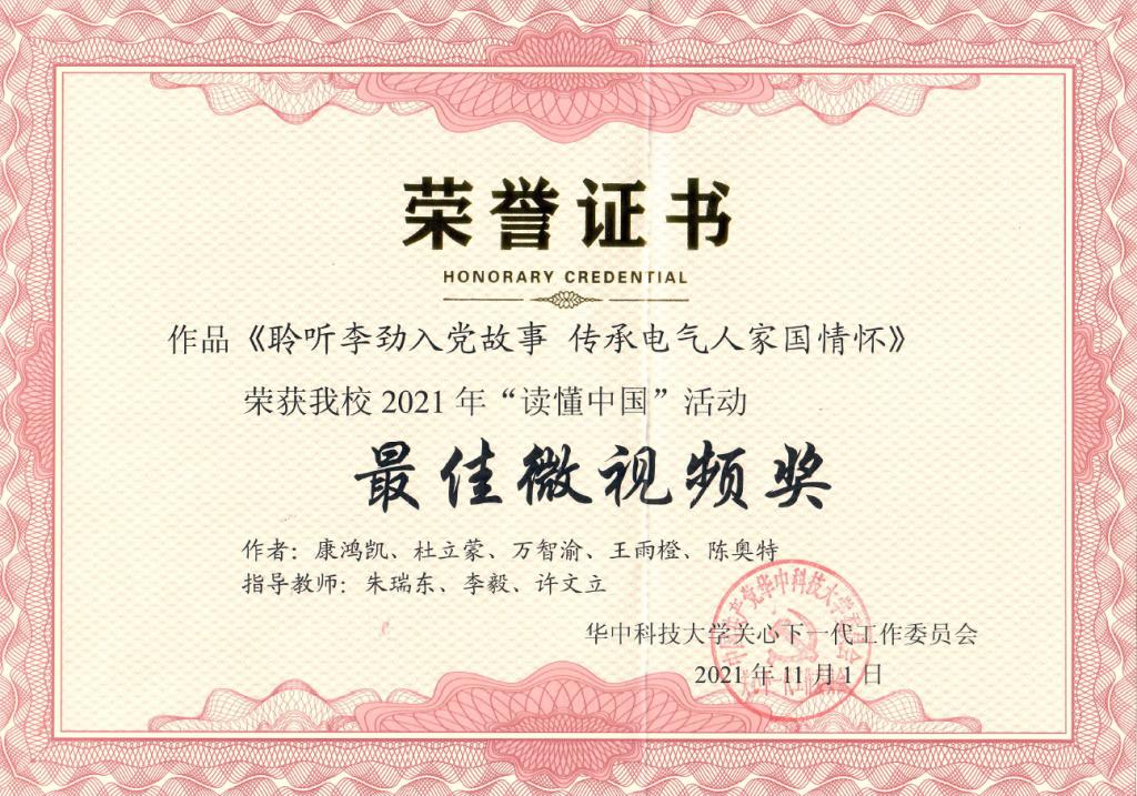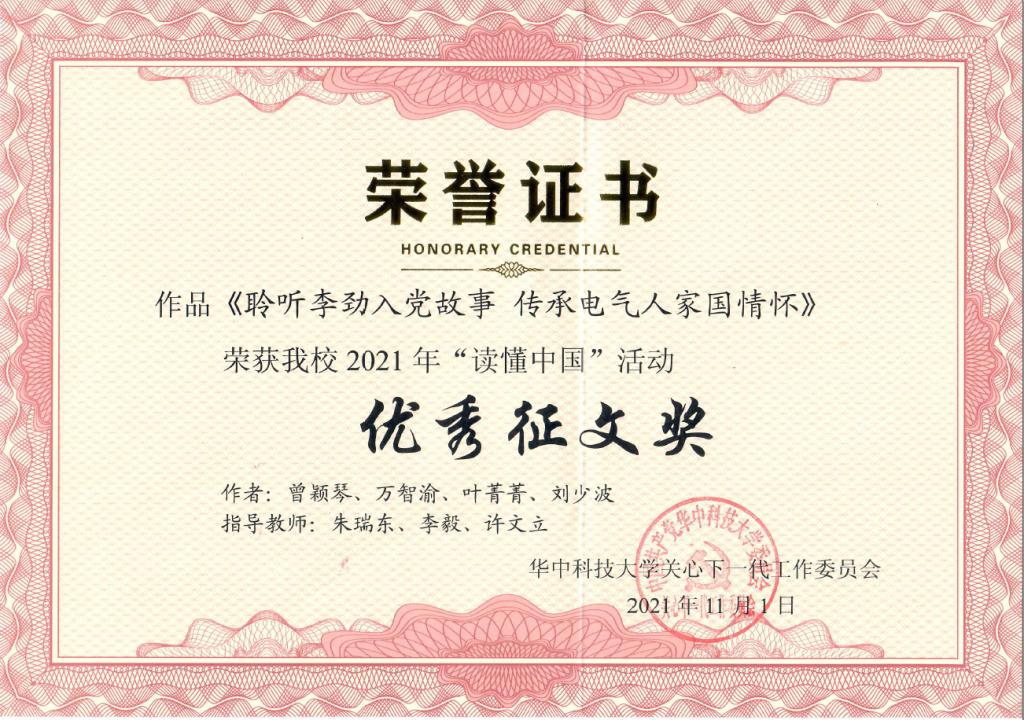 2021年11月1日,taptap点点体育关工委在老年活动中心举行“讲好入党故事——传承红色基因”——2021年“读懂中国”活动颁奖仪式暨作品展演。电气博士2002班党支部作品《聆听李劲入党故事,传承电气人家国情怀》荣获“最佳微视频奖”(作者:康鸿凯、杜立蒙、万智渝、王雨橙、陈奥特,指导教师:朱瑞东、李毅、许文立)和“优秀征文奖”(作者:曾颖琴、万智渝、叶菁菁、刘少波,指导教师:朱瑞东、李毅、许文立)。taptap点点体育荣获“优秀组织奖”。