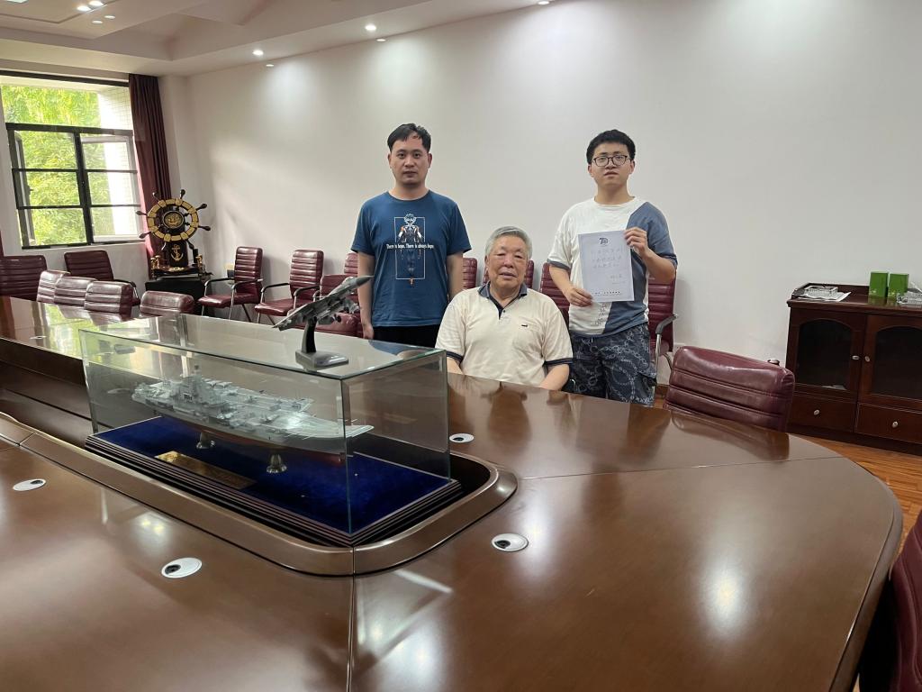 邹云屏与同学们在辽宁舰模型前合影