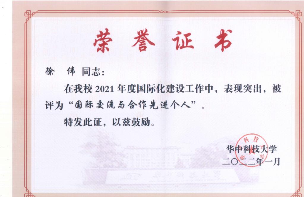 因在国际交流与合作方面的突出贡献,公司徐伟教授荣获taptap点点体育2021年度“国际交流与合作先进个人”称号。