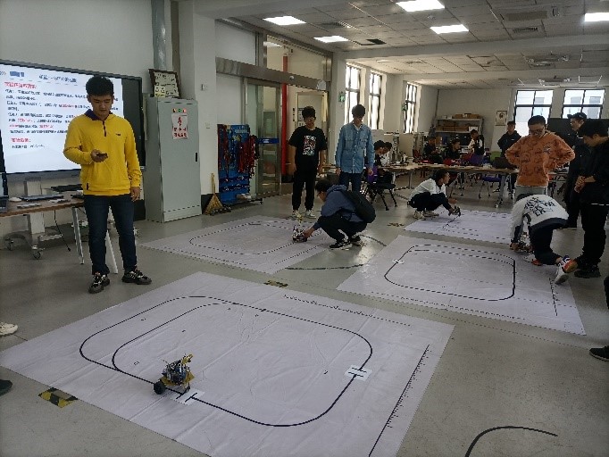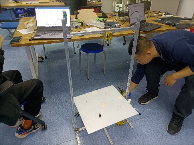 电工基地曾帅雄同学介绍控制组学期中培训结果,并当场演示巡线小车和板球平衡系统的相关功能,让高中生体验运动控制与平衡之美。