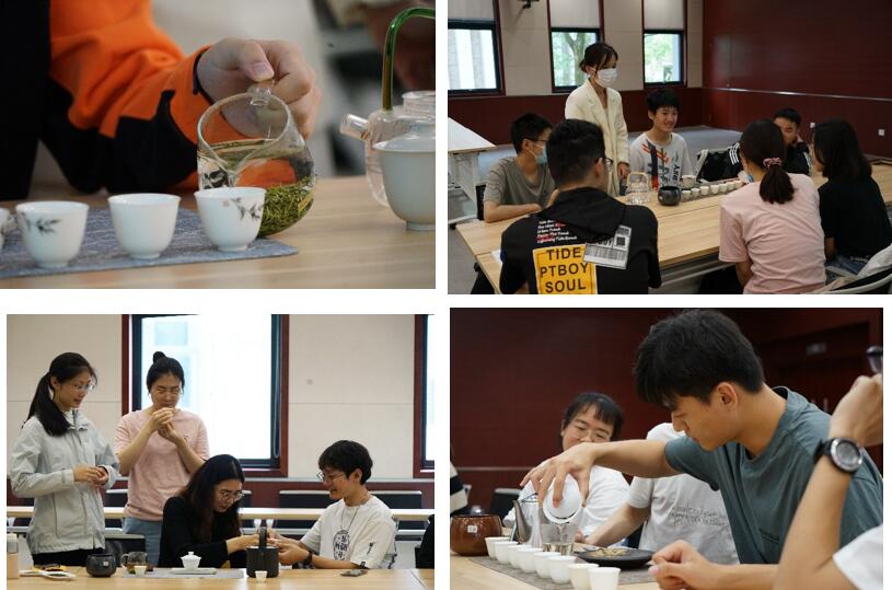 在下午的课程中,同学们学习了红茶的泡制。红茶分为小种红茶、工夫红茶和红碎茶,在本次课程中同学们品尝了正山小种和古树红茶两种茶叶。与绿茶不同的是,红茶需要使用盖碗泡法,并且泡茶的水温更高。每个同学依次体验了盖碗泡茶的手法,经过几次练习之后很快掌握了技巧。王越悦还贴心的为同学们准备了搭配的小吃,让大家感受了休闲的下午茶时光。