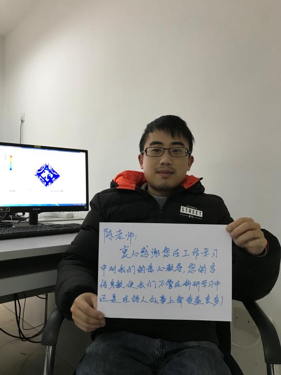 “见到陈老师的第一印象就是这是一个十分严谨的老师,之后的相处也验证了我的第一印象。在平常的工作学习中,陈老师对待知识的态度十分认真,不管是在工程设计时对待参数的细致还是在论文写作中的逐字逐句的仔细修改都让我学到了很多。”身为陈老师的员工,廖同学每当提起自己的导师都充满了感谢之情。
