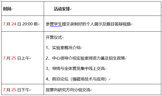 受疫情影响,本次夏令营拟采用网络会议形式举行。线上夏令营期间,广大入选的营员们将享受到一系列精彩纷呈的学术“盛宴”,感受国家脉冲强磁场科学中心及其科研实力。期间,中心领导将向营员们介绍强磁场中心概况,介绍强磁场中心团队力量与招生政策;举行学术沙龙活动,营员对各自选题作PPT展示,充分展示科学素养和科研能力。 详细活动行程安排和规定见附录一。