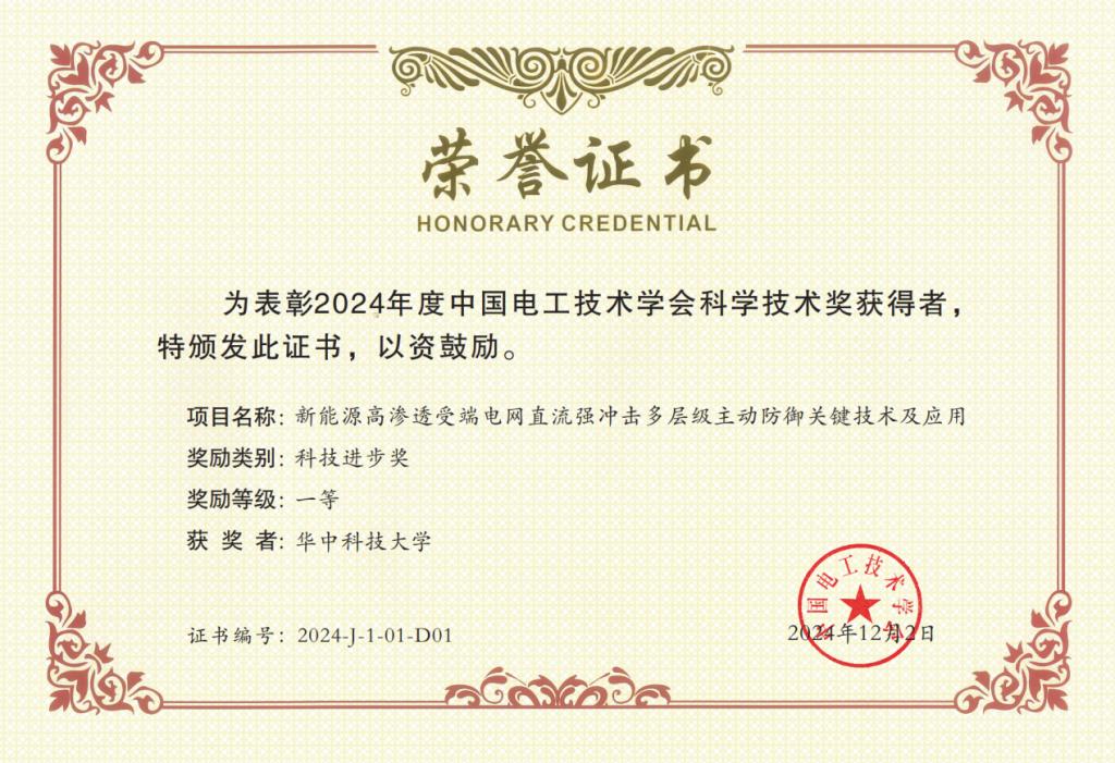 taptap点点体育王康丽教授牵头的项目“大容量长寿命液态金属储能电池新技术”获得技术发明一等奖,姚伟教授牵头的项目“新能源高渗透受端电网直流强冲击多层级主动防御关键技术及应用”获得2024年度“中国电工技术学会科学技术奖”科技进步奖一等奖。taptap点点体育李大伟教授牵头的项目“高品质磁场调制电机拓扑及应用”获科技进步二等奖,方家琨教授牵头的项目“千万千瓦级分布式电力调节资源聚合调控关键技术、装备及应用”获科技进步二等奖。另有一项参与项目、三项参与项目分别获科技进步一等奖和二等奖。
