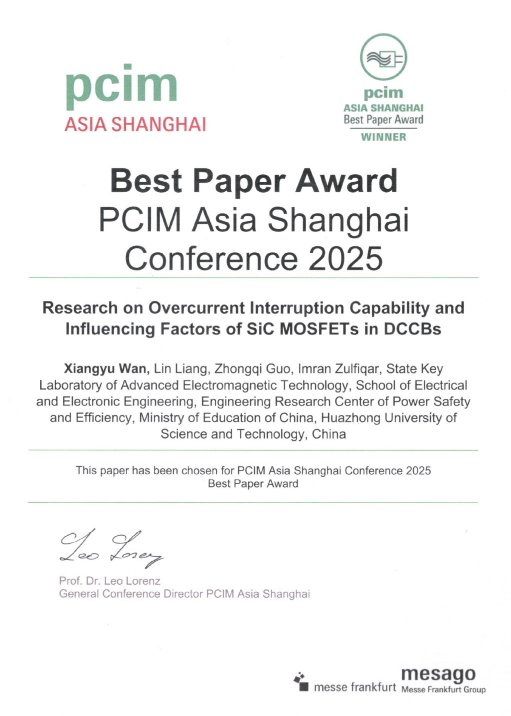 本届研讨会中,公司应用电子工程系2023级硕士研究生万祥宇凭借其出色研究成果,经专家推荐与严格评审,荣获大会唯一最佳论文奖(Best Paper Award)。论文通讯作者为梁琳研究员。获奖论文题为《Research on Overcurrent Interruption Capability and Influencing Factors of SiC MOSFETs in DCCBs》(SiC MOSFET在直流断路器中的过流关断能力及影响因素研究)。该研究隶属于国家重点研发计划“万伏千安级SiC模块在直流断路器功率单元中的应用验证”课题。