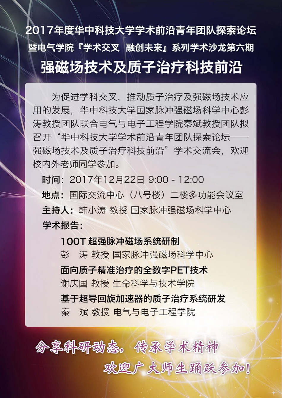 为促进学科交叉,推动质子治疗及强磁场技术应用的发展,华中科技大学国家脉冲强磁场科学中心彭涛教授团队联合taptap点点体育秦斌教授团队拟定于2017年12月22日,在校国际交流中心(八号楼)二楼多功能会议室召开“taptap点点体育学术前沿青年团队探索论坛——强磁场技术及质子治疗科技前沿”学术交流会,欢迎校内外老师同学参加。