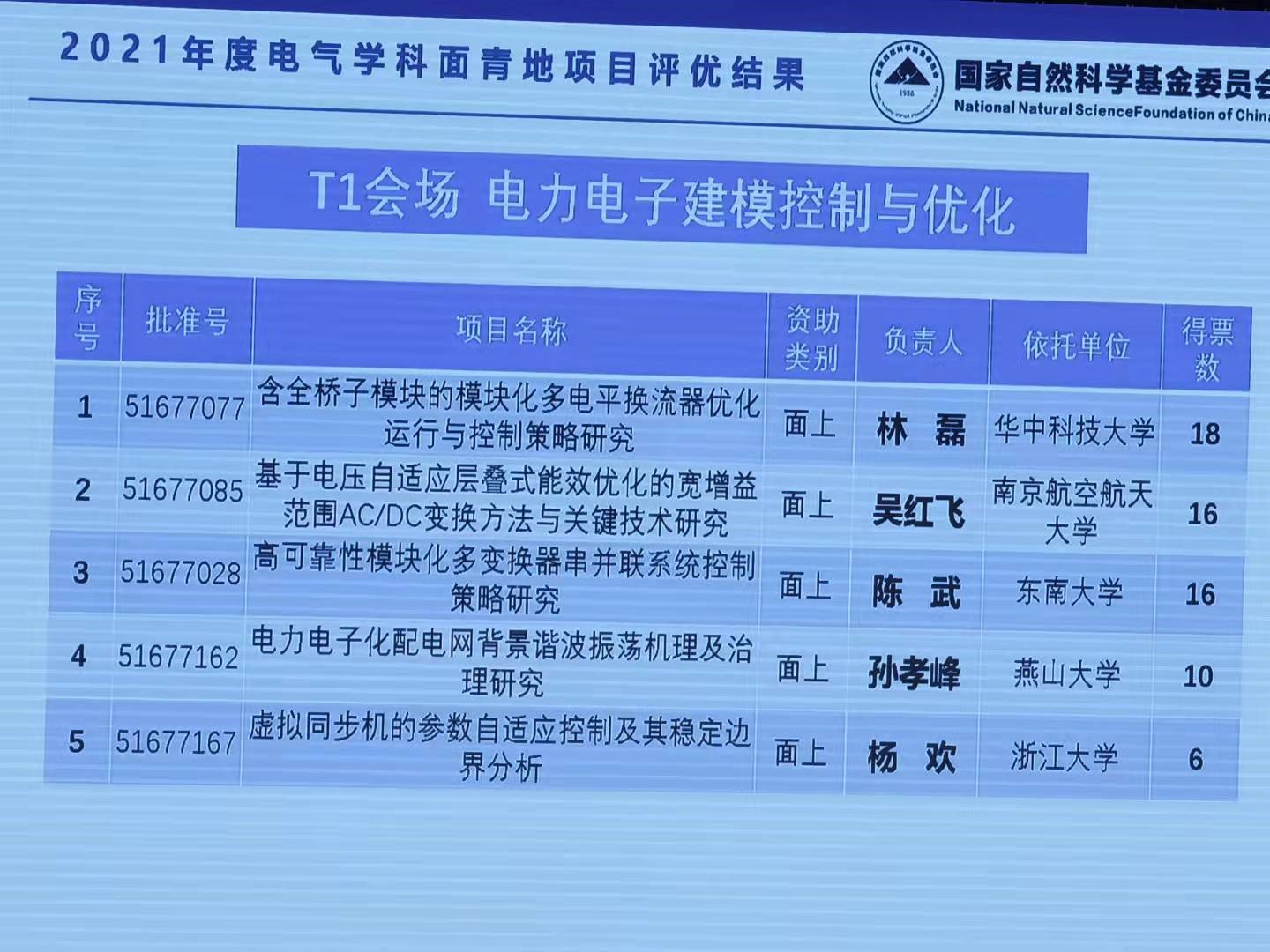 在9月25日的会议闭幕式上,国家自然科学基金委员会电气科学与工程学科项目主任郑雁军教授做了题为“2021年度电气科学与工程学科基金资助与学科工作情况汇报”的大会报告,详细介绍了2021年学科项目申请资助情况,在讲到科学基金改革与电气科学与工程学科工作时,郑主任强调电气科学与工程学科会保护偏基础的研究,关注扶持新兴和交叉方向,同时也会兼顾学科均衡。最后,郑主任宣布了本次面青地年度交流会的评优结果,其中公司应电系林磊教授主持的“含全桥子模块的模块化多电平换流器优化运行与控制策略研究”以小组得票数第一入选优秀结题项目。