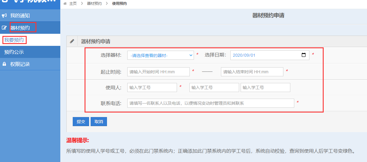 进入“器材预约”-“我要预约”,进行预约。