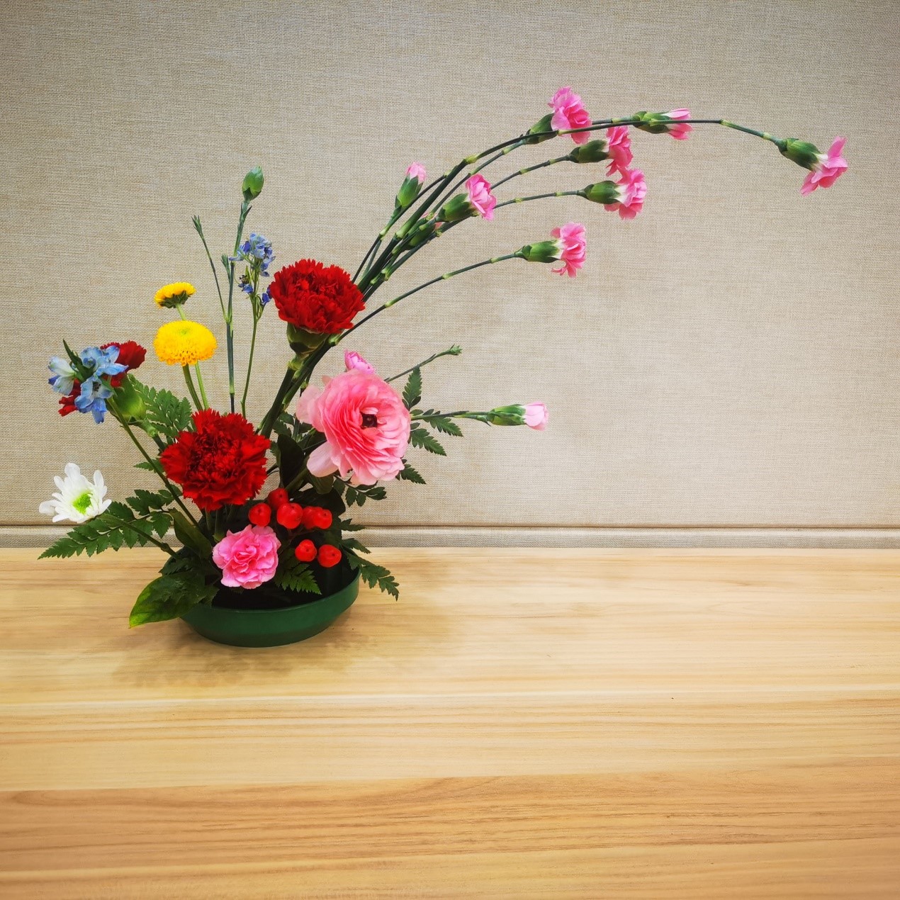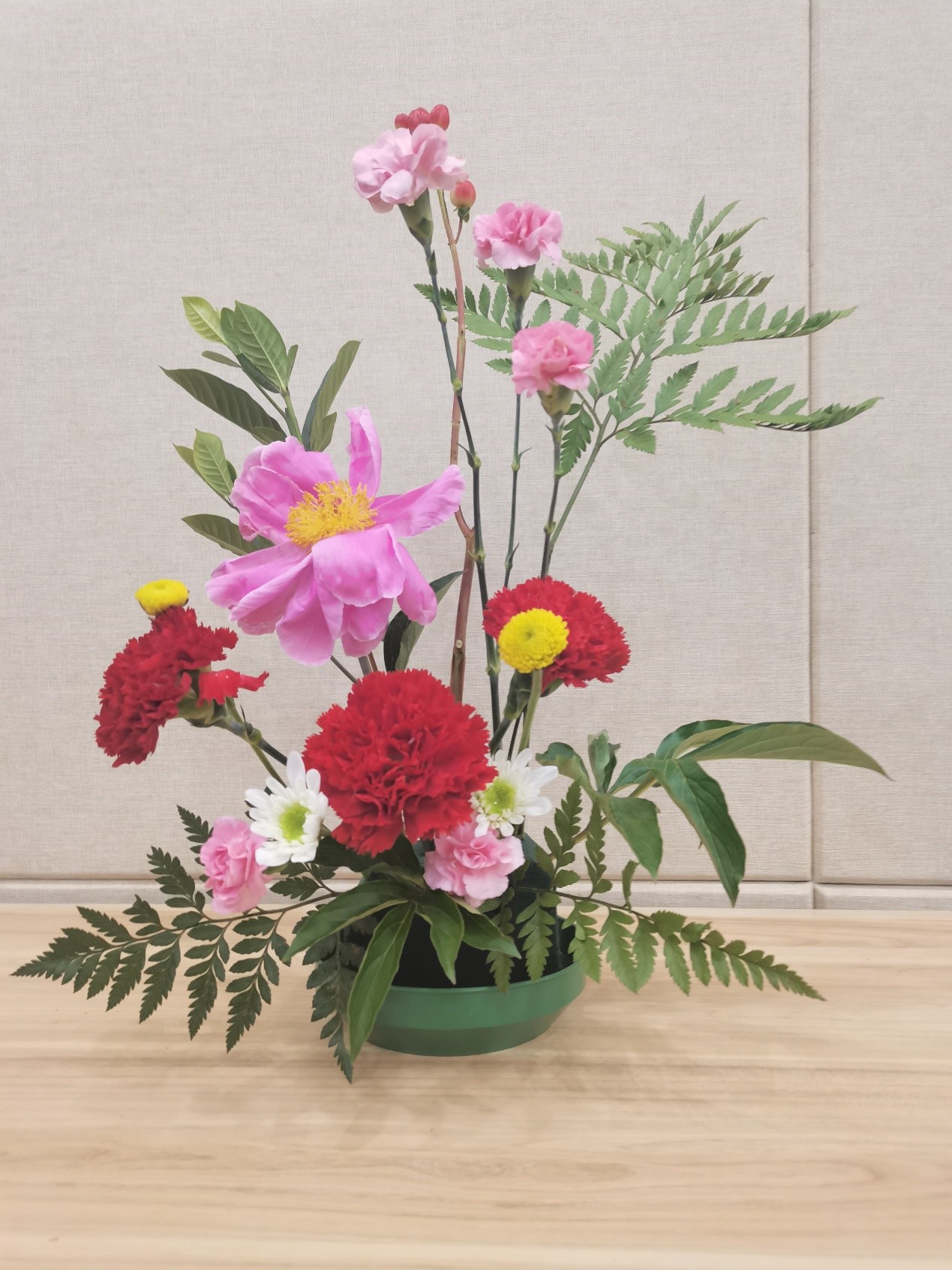 设计思路:三朵艳丽夺目的象征着母爱的康乃馨作为这次插花作品的主花,代表taptap点点体育于我们,就像母亲一样温柔、可靠。三朵康乃馨拥簇的一朵芍药直立而起,代表着已经毕业的华科大学长、学姐们,在公司的怀抱中已然成熟独立,可以为母亲遮风挡雨了。而三朵康乃馨下面的颜色较杂的群花,代表着仍在庇护下成长、深耕的在校学子们。底部颜色无奇的叶草们则代表着科研工作的辛苦和科研生活的平淡,也代表着为了科研甘于坐冷板凳的工作在幕后的科研工作者们,顶部三朵粉花围绕着的几颗石榴果,则代表着公司科研的硕果累累。