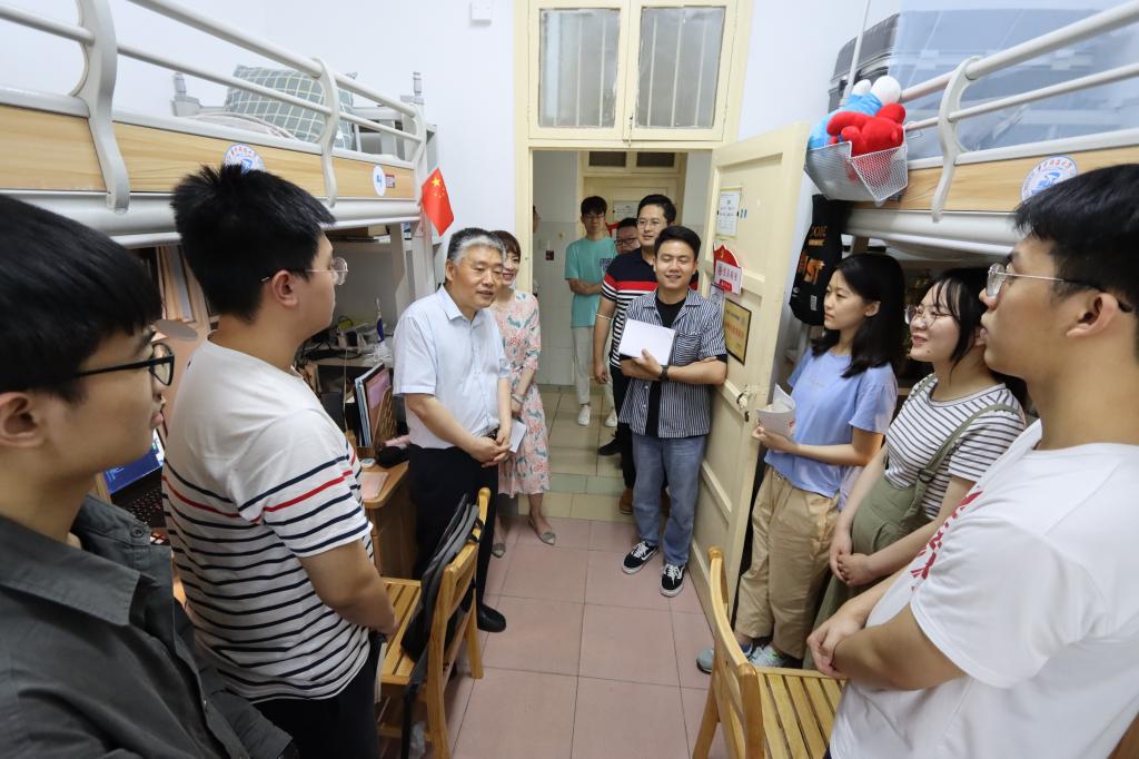 在所结对的328寝室,班级团支书、本科19级党支书付正坤同学详细介绍了班级团支部以及所负责党支部的相关情况。谈及党员的先锋模范作用,校三好员工标兵、学习委员倪谢霆同学向梁茜介绍了班级内部开展党员“一对一”帮扶等能提高班级学习成绩的制度实施情况。梁茜强调,党员同学们要在以德立班、加强荣誉班级建设的过程中发挥重要作用,要多关注班级的集体成长,多关心班上同学的身心发展状况,不让一个人掉队。