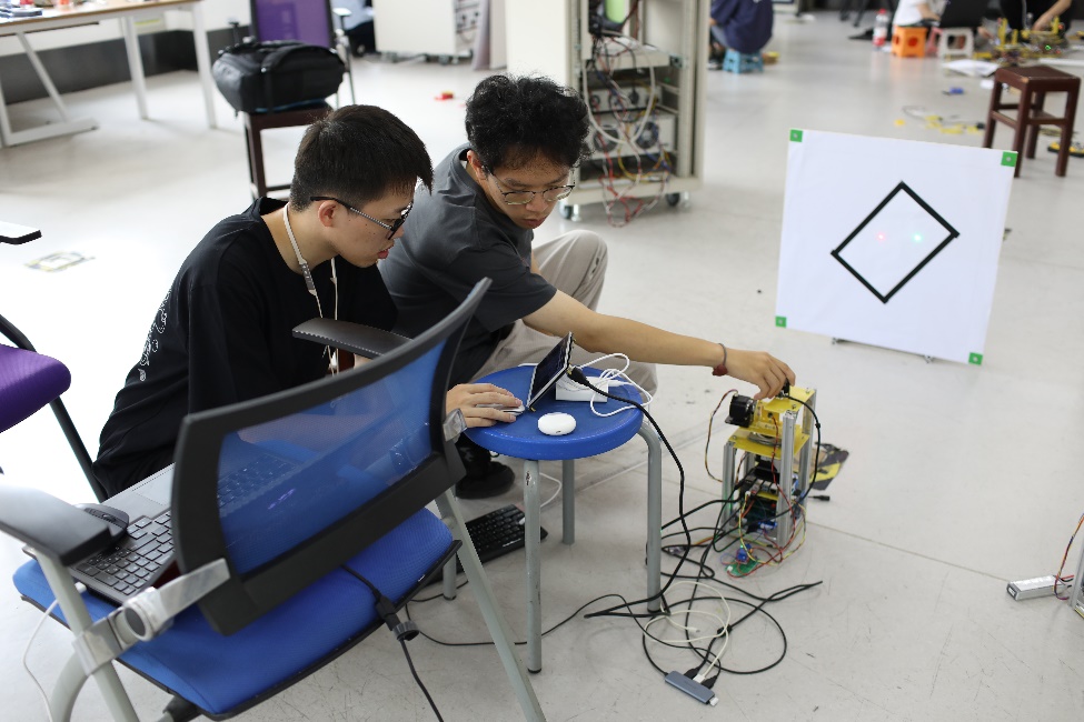 图4为此次电赛控制组火热紧张制作的现场照片。控制精妙的运动跟踪系统、相互追踪的红绿激光点,他们在四天三夜的制作时间内尽善尽美地完成了自己作品,并且顺利达成了题目所要求的指标,取得了近年来最好的成绩。这次国赛既是一次对个人毅力的考验,也是难得的与志同道合的伙伴共同进退的机会。独木不成林,单丝不成线。队员们拧成一股绳的干劲是斩获佳绩的关键力量。每个人都能发挥自己的长处,无论是互相交流解决问题,还是共同努力克服困难,每一位队员的付出都是不可替代的。