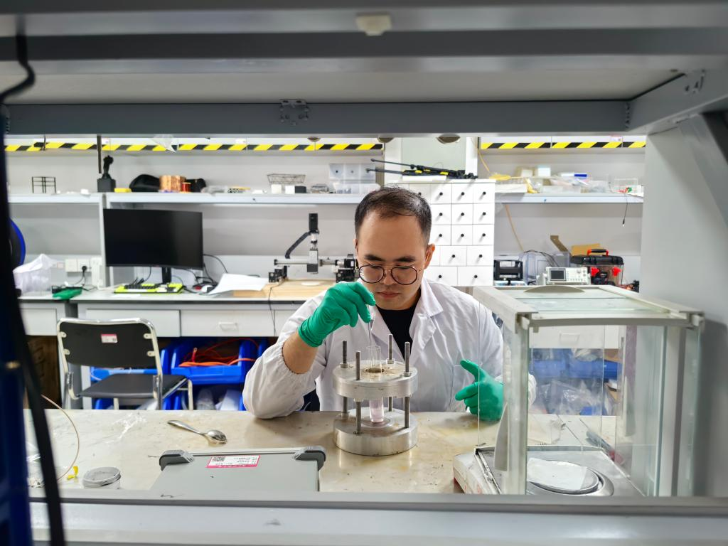 在电气大楼B405实验室,国家脉冲强磁场科学中心的博士研究生朱鑫辉进行负磁泳悬浮实验装置调试,确保新学期的实验计划能够按期完成。