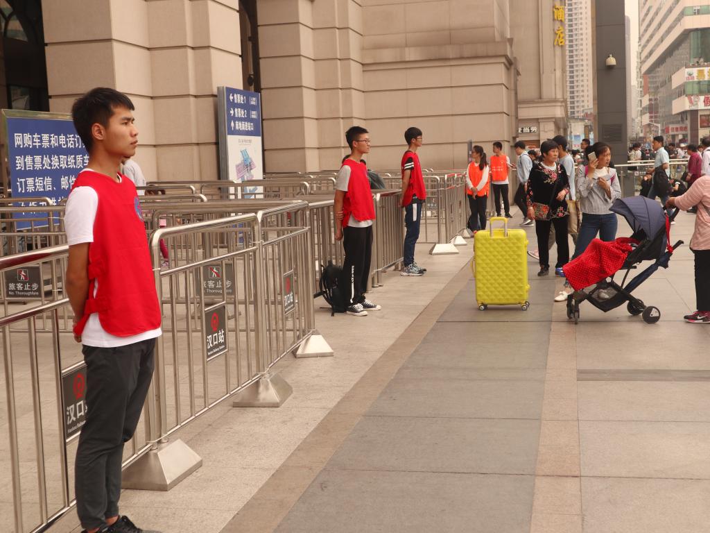 假期之初正是客流量高峰,归家的游子和出行的游客挤成一片人海,各大车站都人满为患。一百余名华中大学子分成十五个小组,在这里作为志愿者,发扬志愿者精神,在各处岗位上开展公益活动。他们在入口为路人指路;在候车厅和取票口维持秩序;在咨询台友好微笑、耐心指导……