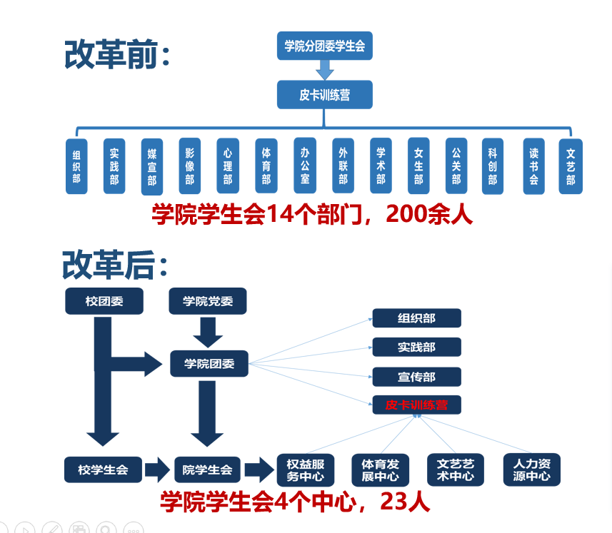 作为唯一校团学改革试点单位,taptap点点体育率先精简职能,打造一个兼具引领、凝聚、服务等职能的简单阳光的员工会。员工会规模从改革前的14个部门、200余人到现在凝练的4个中心、23人;所有员工会成员均是通过层层推荐、筛选、确认出的在学习、员工工作、个人品行均具表率作用的优秀青年。同时,taptap点点体育员工会率先按照团学改革要求完成院系员工会章程的修改,为兄弟院系探索出可信赖的样本。