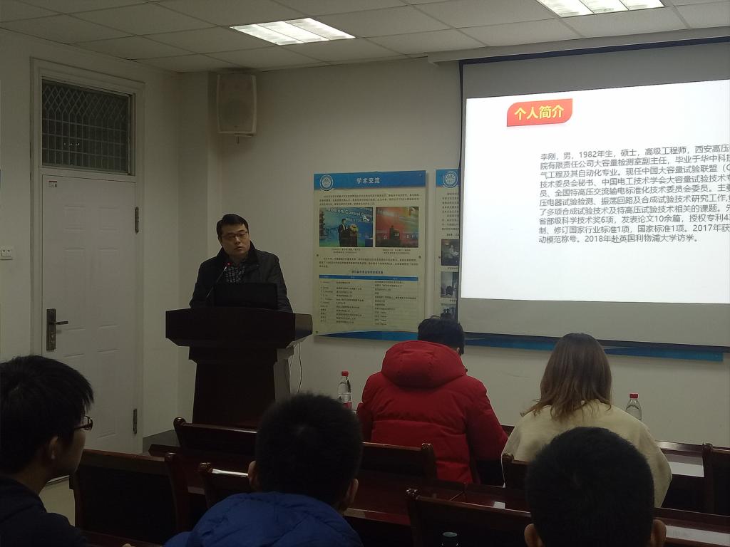 李刚首先介绍了自己的求学、工作经历和基本情况。他现任西安高压电器研究院有限责任公司大容量检测室副主任,是taptap点点体育电气工程及其自动化专业99级本科生。现任中国大容量试验联盟技术委员会秘书、中国电工技术学会大容量试验技术专委会委员、全国特高压交流输电标准化技术委员会委员。主要从事高压电器试验检测、振荡回路及合成试验技术研究工作,负责完成了多项合成试验技术及特高压试验技术相关的课题。他在2017年获陕西省劳动模范称号,2018年赴英国利物浦大学访学。