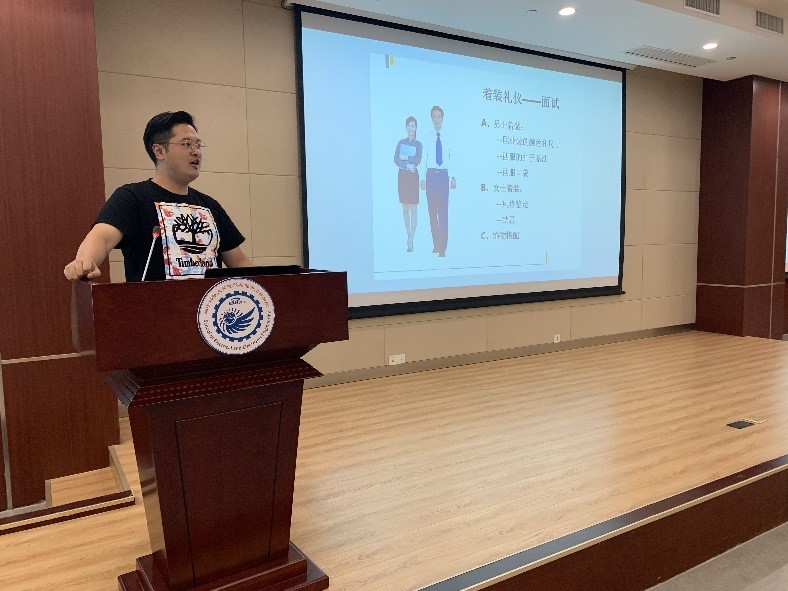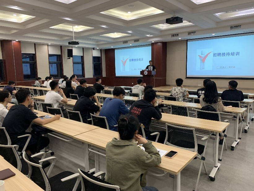 本科18级辅导员、院团委书记柳子逊老师为中心成员进行了接待礼仪培训。他从精神面貌、服饰穿着、交流谈话、乘车礼仪等方面细致讲解了商务接待礼仪的基本知识,强调了良好的礼仪对于塑造公司良好形象、传播就业沟通信息、提高招聘合作效率的重要意义。最后,柳子逊鼓励大家在接待服务中提升自己的职业素养和交际能力,争取早日找到理想的工作。