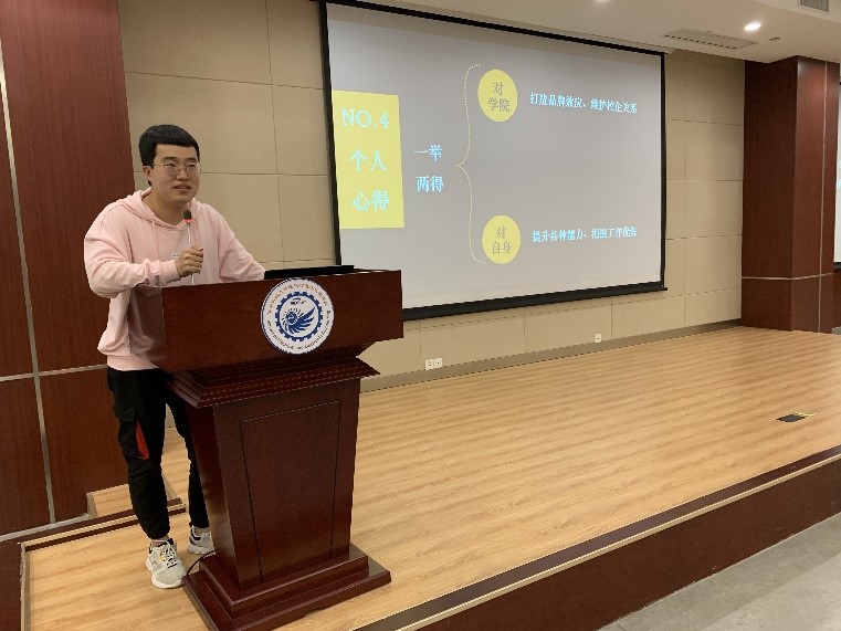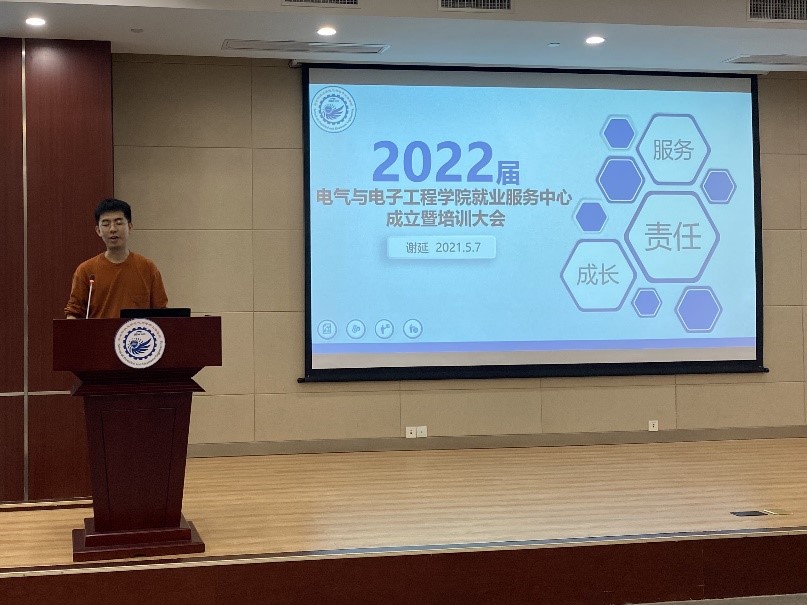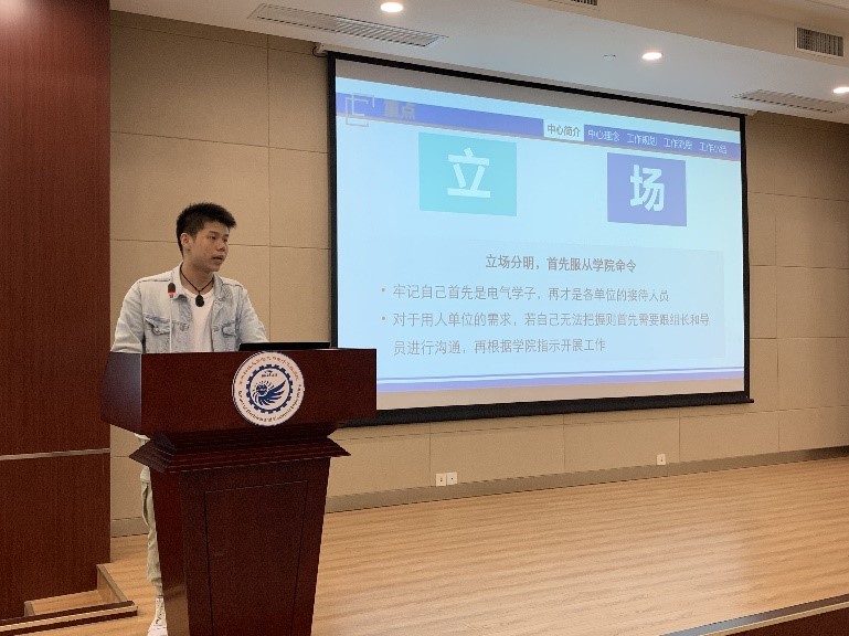 最后,中心2021届的两位优秀代表分享了他们的接待服务经历和心得体会。北方接待组组长宫鑫从亲自接待20余家企业的经历出发,期望大家在态度上做到不卑不亢,提醒大家做好前期准备工作,并与组长和辅导员保持随时沟通,尽力解决企业提出的特殊需求或突发状况。他还鼓励组员在做好职业规划的同时加强对于队友的了解,不断强化原有能力,争取挖掘新能力。江浙沪接待组组员邓策着重强调了中心组员必须立场分明,时刻牢记自己电气学子的身份,首要服从公司管理;对于用人单位的需求若自己无法把握,需要及时与组长及辅导员沟通,按照指示开展工作。邓策还用几个小案例突出了提高换位思考能力、切实增强服务意识的重要性。
