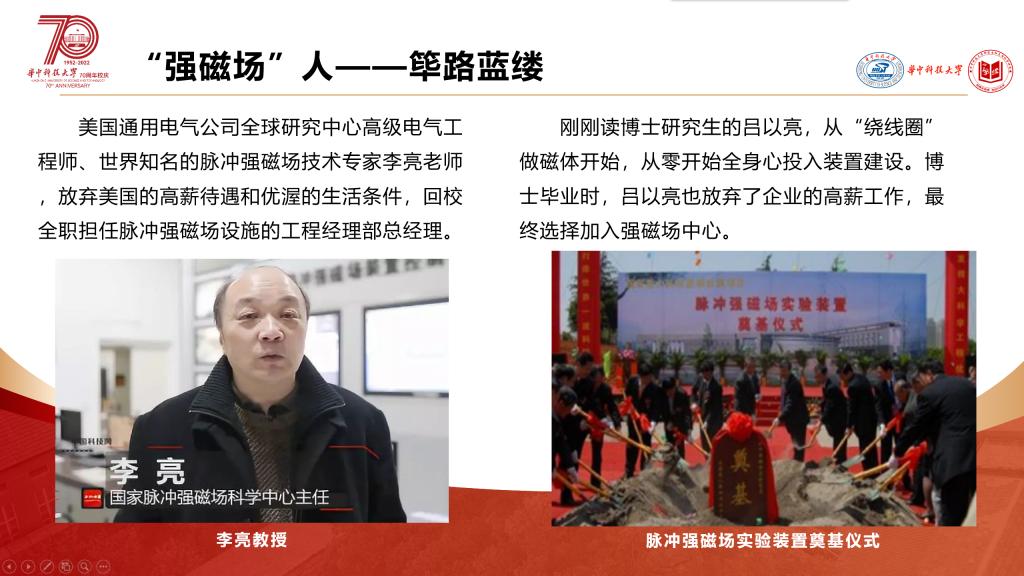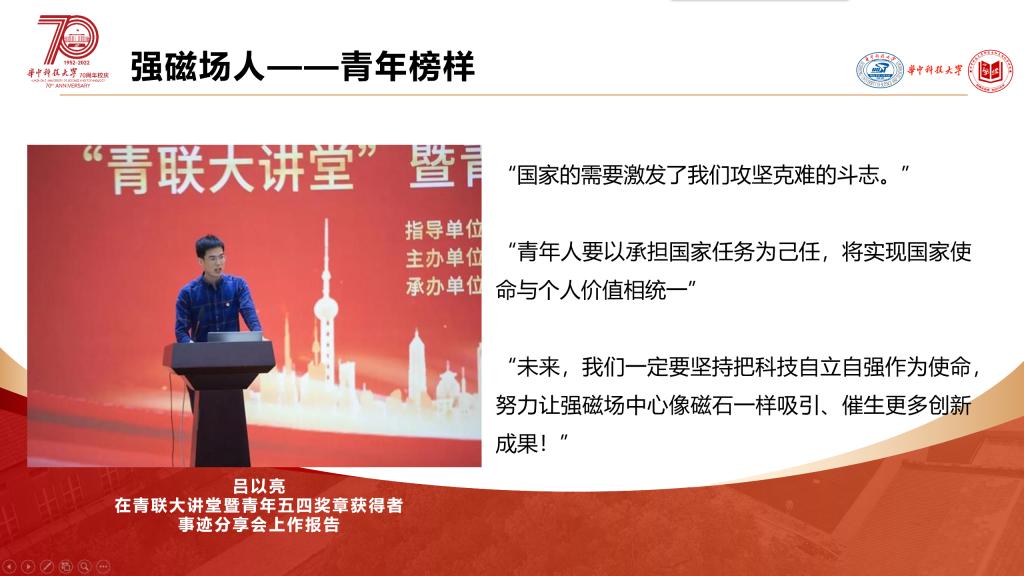 楼奕轩首先从“场”的概念出发,介绍了建设脉冲强磁场的重要科学意义。紧接着,她结合潘院院士首提建设强磁场建议(2001)、李亮教授全职回国组建团队(2007),到国家发改委正式批复建设设施(2007)、教育部正式批准成立国家脉冲强磁场科学中心(2011),再到成功实现世界第三、亚洲第一的峰值磁场强度水平(2013)、荣获国家科技进步一等奖(2019),分享了强磁场人同心奋斗、强磁场从无到有到世界领先的故事。最后,楼奕轩引用习近平总书记重要讲话:“自力更生是中华民族自立于世界民族之林的奋斗基点,自主创新是我们攀登世界科技高峰的必由之路”,勉励全体同学将习近平总书记的重要嘱托转化为干事创业的行动。
