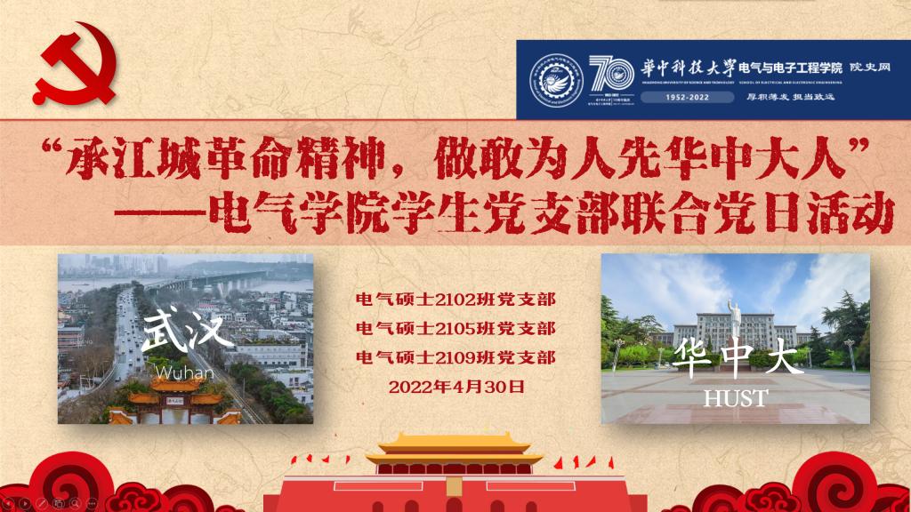 为丰富党史理论学习形式,促进党日走深、学习走实,2022年4月30日上午9点,taptap点点体育硕士2102班党支部、硕士2105班党支部、硕士2109班党支部在电气大楼B203报告厅开展了“承江城革命精神,做敢为人先华中大人”联合党日活动,以“线上云参观”、“线上云打卡”形式开展主题实践,在回顾党的历史、传承红色精神的同时,坚定新时代“华中大电气人”的使命和担当,献礼华中大70周年校庆及taptap点点体育70周年院庆。