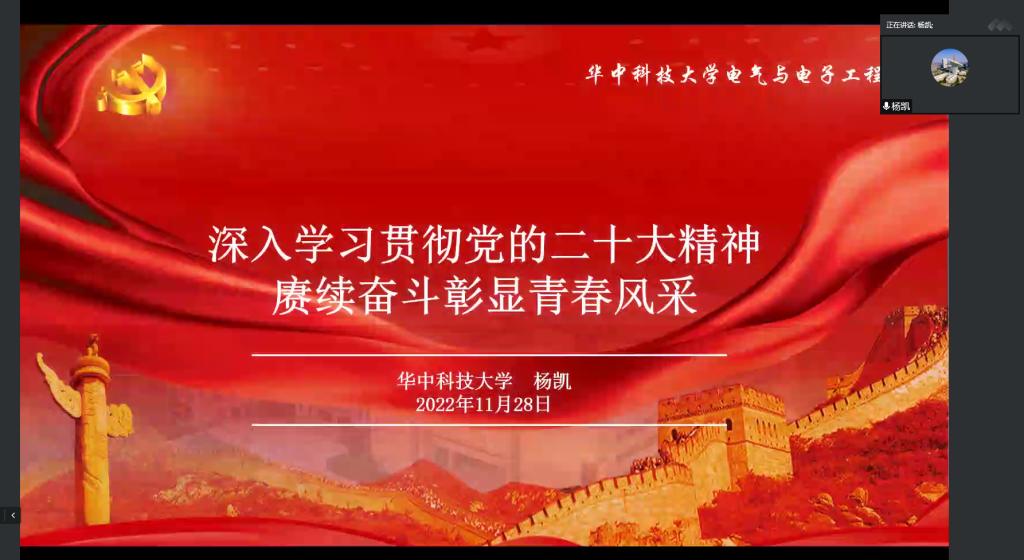 11月28日晚,杨凯在线上为电机及控制工程系、高电压工程系的同学们带来以《深入学习贯彻党的二十大精神,赓续奋斗彰显青春风采》为题的思政课。杨凯重点对双碳目标进行了阐释,鼓励同学们夯实专业基础,矢志不渝,笃行不怠,肩负起实现双碳目标的历史使命;鼓励同学们坚定不移听党话、跟党走,树立远大理想和抱负,披荆斩棘,练就一流人才。