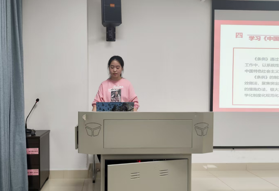 随后,全体同学集中学习了《中国共产党思想政治工作条例》。吴梓钰从制定的背景意义、主要内容以及贯彻落实等方面进行了详细解读,并鼓舞支部成员不断提高思想政治觉悟,用党的创新理论武装头脑、指导实践。