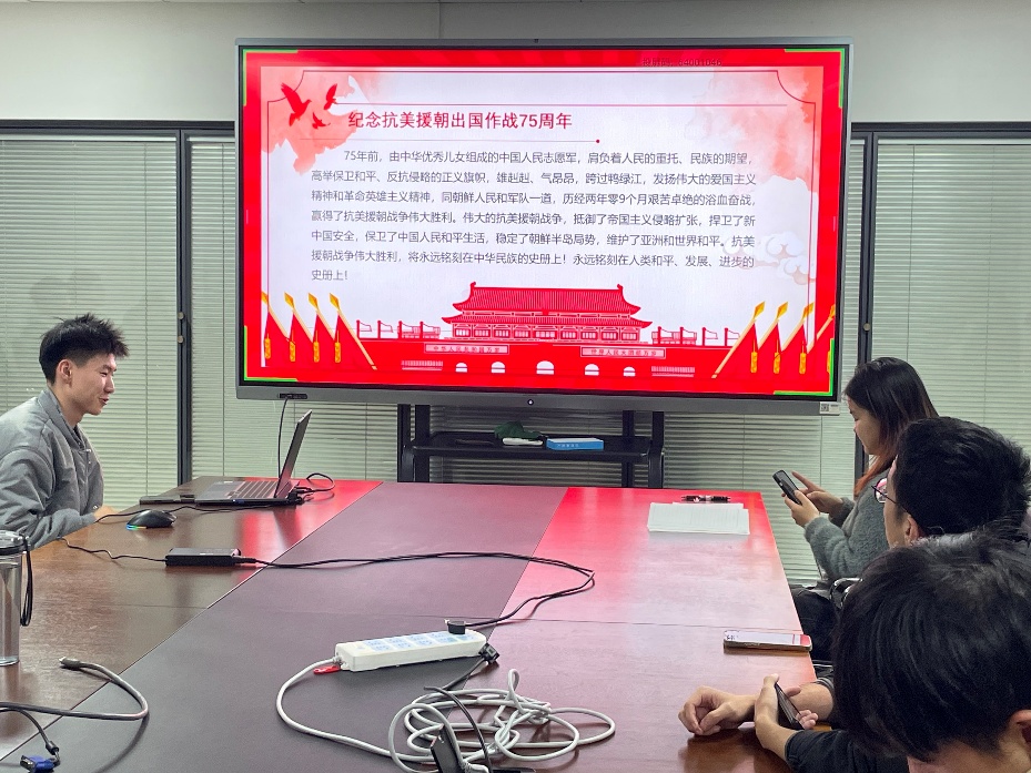 最后的微党课环节,徐浩轩同志带领支部全体党员共同学习习近平总书记在纪念中国人民志愿军抗美援朝出国作战70周年大会上的重要讲话精神,带领大家重温那段气壮山河的历史,深刻体悟伟大抗美援朝精神的丰富内涵与时代价值。