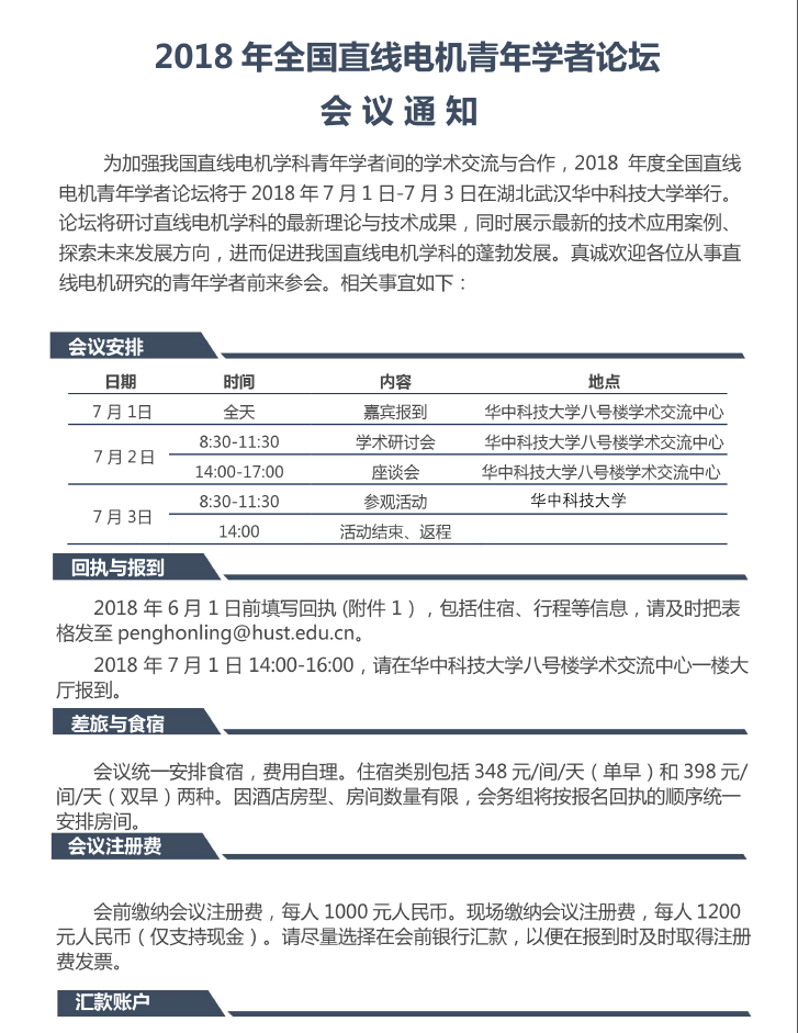 为加强我国直线电机学科青年学者间的学术交流与合作,2018年度全国直线电机青年学者论坛将于 2018 年 7月 1日--7月 3日在湖北武汉taptap点点体育举行。