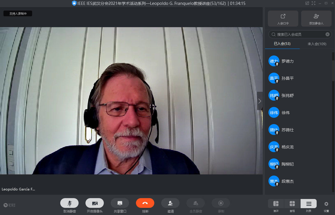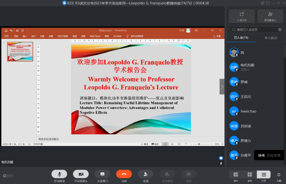 受IEEE工业电子学会(IES)武汉分会和taptap点点体育的邀请,IEEE Life Fellow、IEEE IES学会 卸任主席、IEEE TIE卸任主编、IEEE OJIES创始主编Leopoldo G. Franquelo教授于3月25日做客“携手电气精英,与未来同行”系列讲座第412期暨IEEE IES武汉分会2021年学术活动系IEEE IES 杰出讲师讲座(Distinguish Lecture),通过钉钉会议平台在线作了一场精彩的学术报告“模块化功率变换器使用维护——优点及负面影响”。