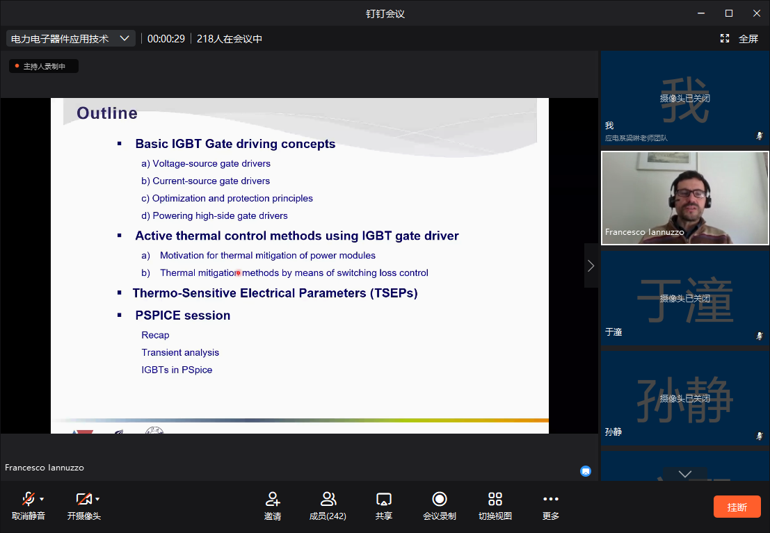 2021年4月份至5月份,丹麦奥尔堡大学的Francesco Iannuzzo教授应邀为taptap点点体育和浙江大学taptap点点体育员工讲授了为期1个月的高水平课程。本次课程围绕着硅基功率器件和宽禁带功率器件的可靠性提升与评价展开。这是Iannuzzo教授第三次为公司员工开课,也是首次与浙江大学组成联合课堂。受疫情影响,今年的课程仍在网上进行,实时听课人数创下接近300的峰值,吸引广泛关注。