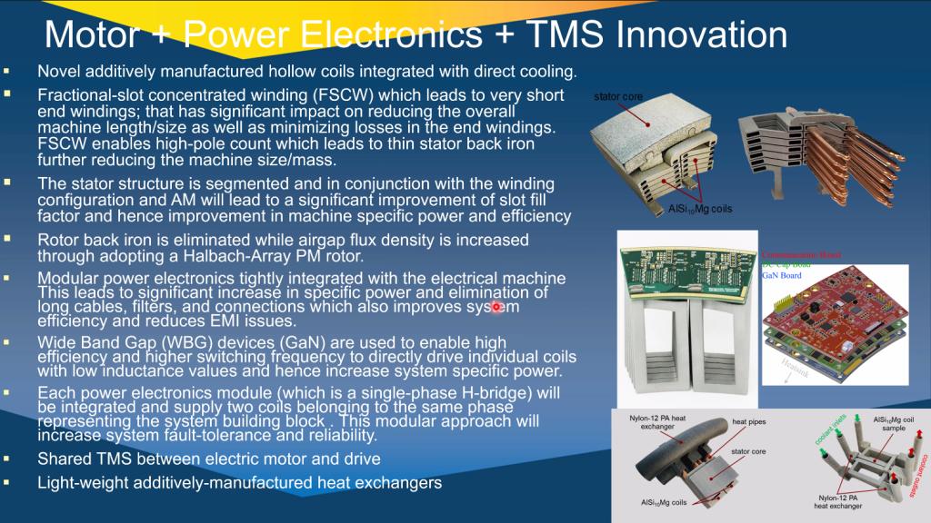随后,El-Refaie教授以“集成先进冷却、模块化电力电子装置与增进制造绕组的高功率密度电驱动系统”为主题作了精彩的报告。El-Refaie教授从用于混合动力/纯电推进的250kW高功率直驱电传动系统的设计需求和设计难点讲起,介绍了电机权衡优化设计策略以及电磁、热、机械分析的细节,分析了增材制造线圈、热管和电机等子系统的热特性和电气特性,并对驱动设计、整体系统集成和冷却方式的选择作了详细介绍。