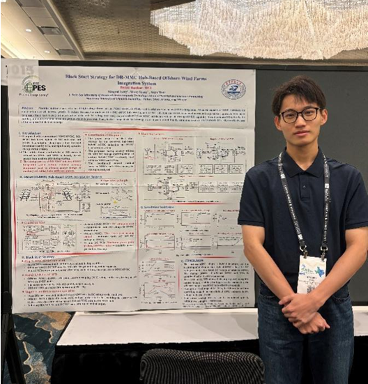 7月28日,电力工程系23级硕士生杨明睿进行了题为“Black Start Strategy for DR-MMC Hub-Based Offshore Wind Farms Integration System”的论文海报展示(指导老师:向往教授),并与来自英国阿伯丁大学、加拿大蒙特利尔理工公司的专家学者进行了交流。该论文针对基于DR-MMC功率枢纽的海上风电并网系统,提出了一种协调利用陆上混合MMC宽电压运行范围和交流风电机组低电压穿越能力的启动策略。与传统的启动方法相比,该方法无需在海上平台处配置额外设备,具备一定的经济性优势。