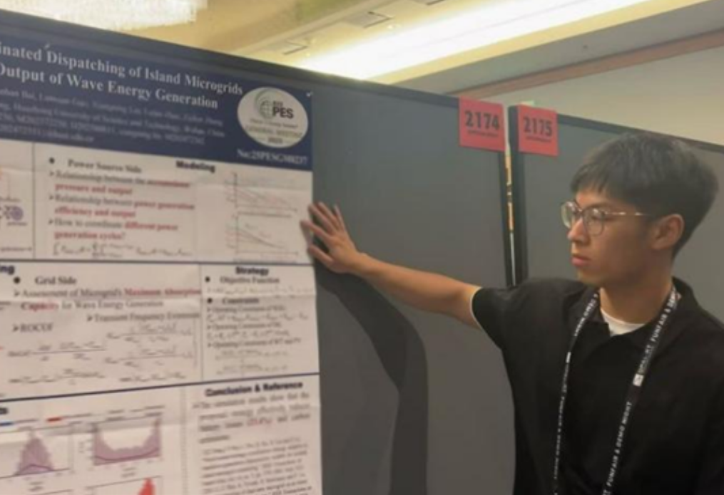 同一时间,电力工程系23级硕士贺玮杰同学进行了题为“Source-grid-storage Coordinated Dispatching of Island Microgrids Allowing Non-steady Output of Wave Energy Generation”的海报展示,同来自斯坦福大学的学者以及香港理工大学的卜思齐教授进行了深度交流。该论文针对远海岛屿微网系统,提出了一种新型的波浪能发电并网及运行模式,在不威胁微网频率安全的前提下,可以最大化消纳包括风光以及波浪能在内的可再生能源,同时极大地减少了储能的寿命损耗。与传统的运行方式相比,该方法具有显著的经济性和碳减排效益。