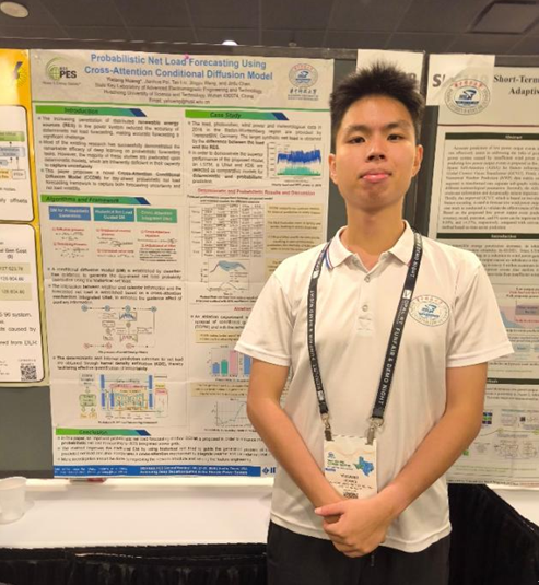 电力工程系23级硕士生黄轶翔同学也在7月28日晚上进行海报展示,并于7月29日早上参加海报竞赛,汇报题目为“Probabilistic net load forecasting using cross-attention conditional diffusion model”,展示改进扩散模型进行净负荷区间预测研究的方法论述和实验分析等内容。他在传统的利用扩散模型进行净负荷概率预测的基础上,使用条件引导机制引入历史功率序列信息,利用交叉注意力机制整合天气和日期特征,以提升预测的准确性,为运行调度提供丰富的不确定性信息。