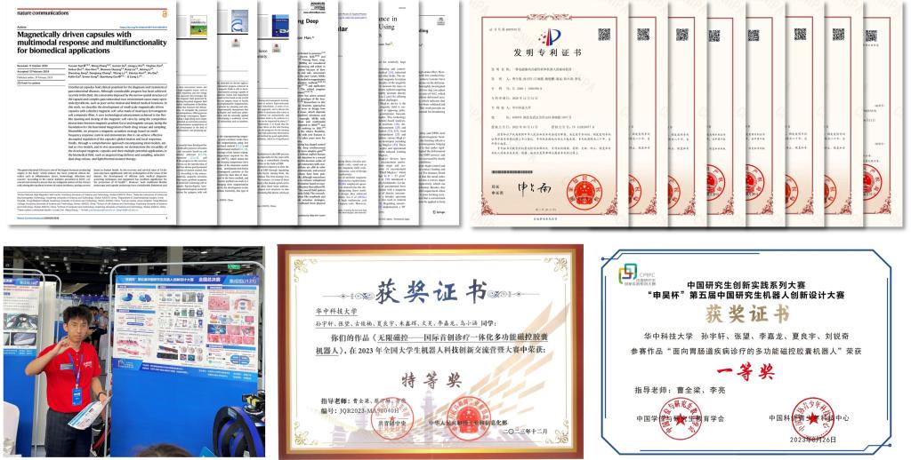 医工攻坚,守护生命健康。面对我国高端医疗装备长期受制于人的困境,孙宇轩组建跨学科攻关团队“无限磁控”,深入武汉协和医院等临床一线调研,将磁控软体机器人技术与临床需求深度融合。针对现有胶囊机器人“只能诊、不能疗”的难题,孙宇轩及其所在团队首次将磁控软体机器人技术引入胶囊设计中,打破了传统内置刚性永磁体设计模式,形成国际首创的磁控软体胶囊机器人技术路线,为实现胶囊机器人诊疗一体化提供了全新方案。所开发机器人较国际水平体积减小25%,有效载荷提升5倍。凭借这一创新成果,孙宇轩带领团队先后斩获2024年中国国际老员工创新大赛金奖、2023年全国老员工机器人科技创新交流营特等奖、第五届中国研究生机器人创新设计大赛全国一等奖等双创赛事最高荣誉。
