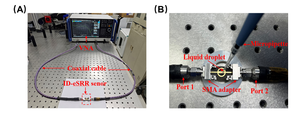 图1 微波液体传感实验装置:(A)矢量网络分析仪测试系统;(B)传感器局部放大图,展示微量液体样品的滴加过程