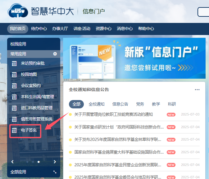 2.登录“智慧华中大”,在“校园应用”里找到“电子签名”。