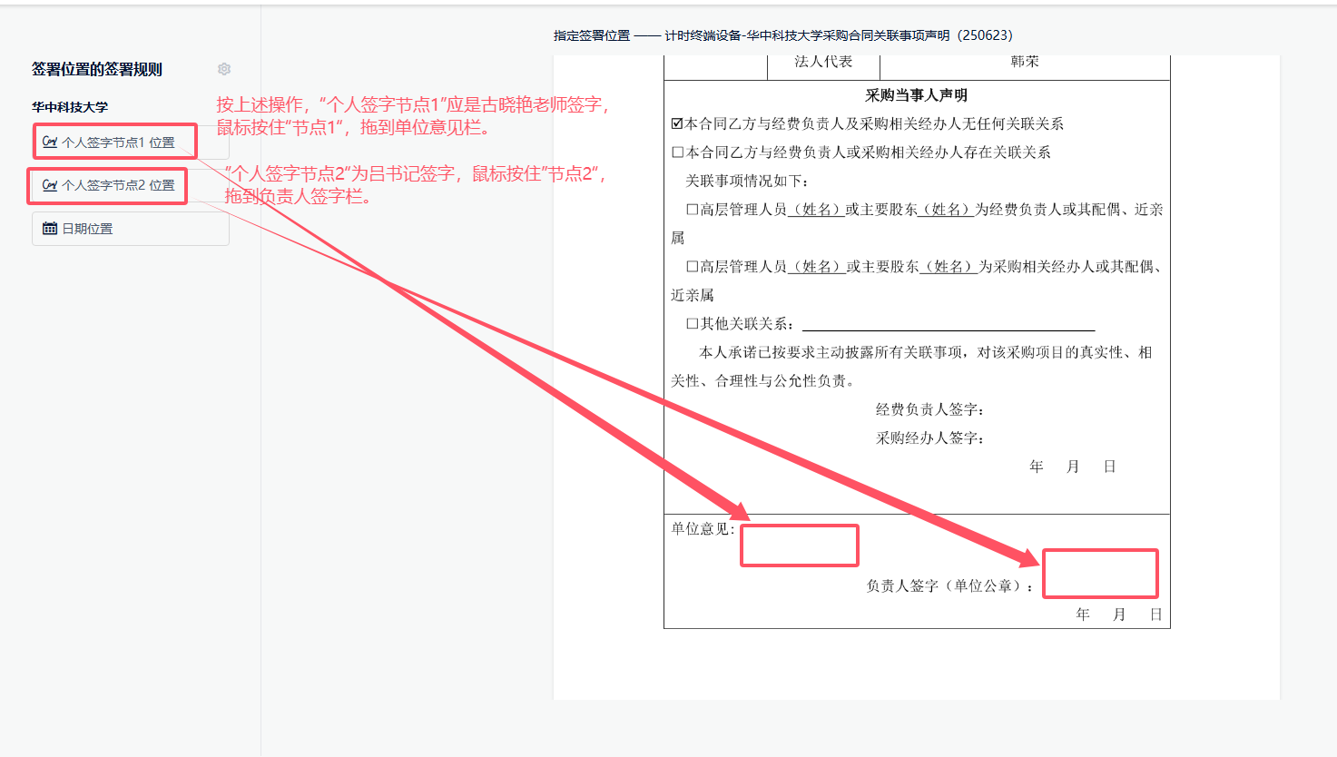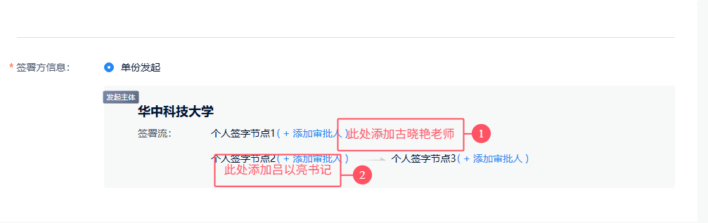 添加审核人:如图按需求顺序添加“个人签字节点1”--“个人签字节点2”···