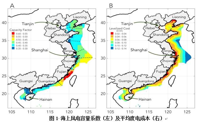 海上风电的技术经济性评估。巨大的经济可开发潜力。该研究利用最新的气象、海文和经济数据(NASA的MERRA-2数据集),重调至高分辨率测深数据集的同化风速后,经过水深、保护区、航道使用情况进行过滤,在0.03°×0.03°的精细尺度下评估中国沿海海上风电过去40年每小时的风电出力变化。研究结果以容量系数、度电成本的形式展示,如图1所示。研究表明:海上风电的技术可开发潜力超过2000GW,经济潜力将在2030年超过东南沿海省份的用电总需求;受气象条件、海岸及水深的共同影响,国内海上风电最具潜力的地点集中在福建、浙江、江苏等地。