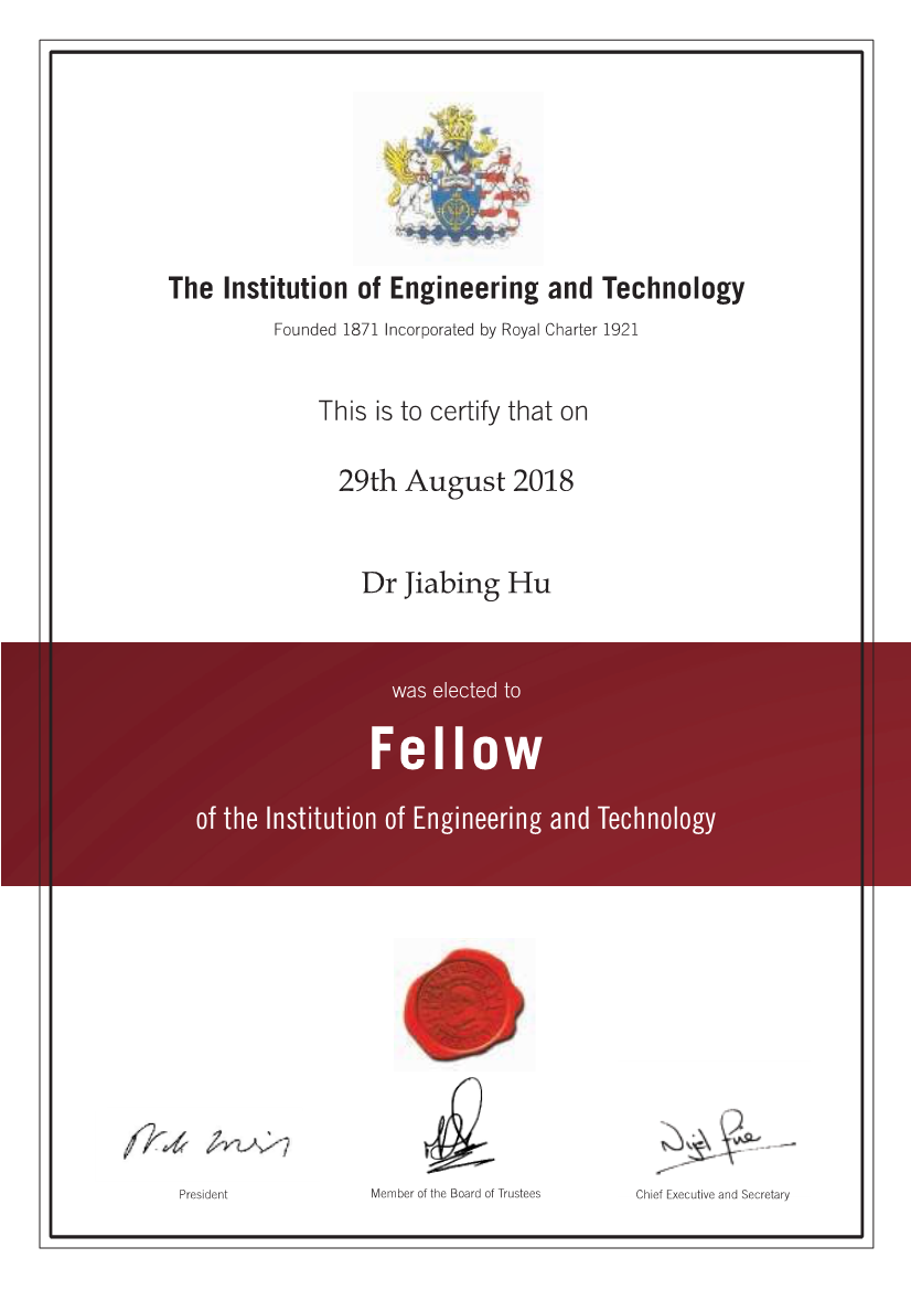 taptap点点体育教授胡家兵当选2018年度英国工程与技术学会会士(Fellow of the Institution of Engineering and Technology, IET Fellow)。