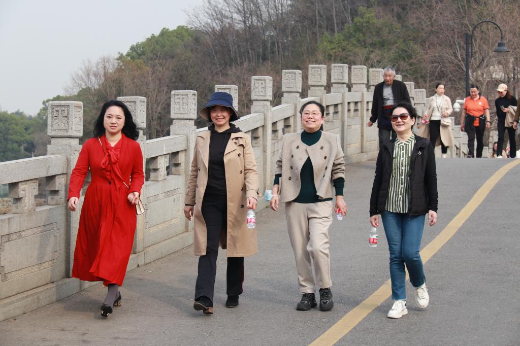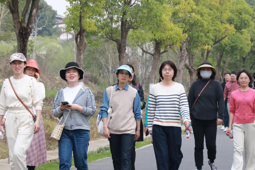 湖溪河畔,阳光普照,微风拂面,路旁的杨柳也招展起了枝条,天朗气清,令人惬意。沿着绿道,河畔风景依旧,却多了一群平日对工作兢兢业业的女园丁,她们闲庭信步,举手投足之间都透露出当代知识女性独特的魅力与自信。一路上,大家有说有笑,从工作趣事到生活琐事、从教学经验到沿途风景,无话不谈。