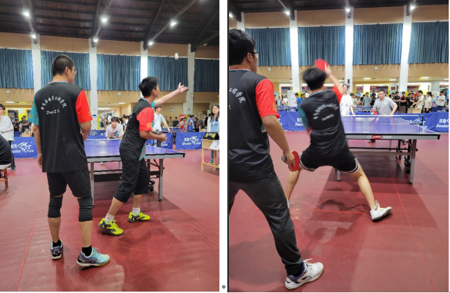 攻防博弈彰显智慧,竞技精神闪耀全场。下午淘汰赛中,电气战队延续火热状态,先后力克环境公司和集成电路公司挺进八强。在1/4决赛中,弧光队与本届冠军机械公司展开巅峰对决,双方鏖战至决胜局,最终以2:3惜败;电挚队则与季军网络安全公司上演攻防大战,虽未晋级却以“每局分差不过3分”的精彩表现赢得对手致敬。其中彭小圣老师在首局失利后,凭借独创的左侧旋小球战术实现逆转,赢得全场喝彩。男单主力贾伊非同学以“长短结合、虚实相生”的战术体系,发球落点刁钻,且带有强烈旋转或速度,使对手难以预判球路,成为赛场焦点。师生双打中,陈忠勇老师和黄轶翔同学、赖智鹏老师和吕葳衫同学,配合默契,优势互补,力量与速度并存。所有参赛队员将个人的优势发挥得淋漓尽致。