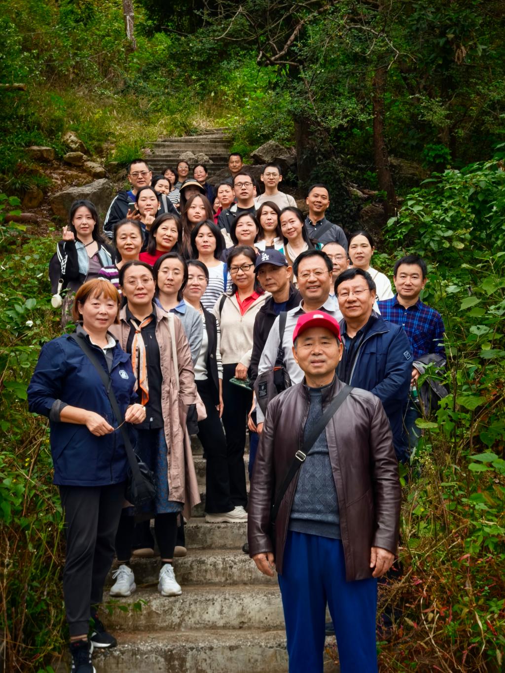 九时许,队伍抵达八分山山麓的依山小院,徒步之旅正式开启。沿石阶上行,秋林疏朗,风携草木清香萦绕身旁。行至陡峭的楼梯步道时,几位老师扶着石阶旁的树干放慢脚步,额角渗出细汗,有老师喘着气笑道“这坡还真有点陡,爬得人腿发酸,但这样才够劲儿,正好给久坐办公室的身体好好松松筋骨!”。爬到八分亭时,远处城区轮廓渐显,汤逊湖波光隐约,大家迅速掏出手机记录,有的以亭为景抓拍微笑,有的拉着同事合影,与秋日山色共画,记录山水美好。继续前行至气象塔附近,视野豁然开朗——江夏城区的红顶民居与远处的山水交织成景,汤逊湖的粼粼波光隐约可见,正如“山有水分流如八字”的得名渊源,眼前的风光尽显八分山的独特韵味。徒步途中,汗水浸湿衣衫,却挡不住大家的热情。“平时伏案工作久了,难得这样亲近自然,登山时一步步向上,感觉心里的浮躁也被慢慢抚平了。”“和同事们一起边走边聊,不仅锻炼了身体,还拉近了彼此的距离,这样的活动太有意义了!”老师们你一言我一语,分享着登山的感悟。十一点半,队伍沿水泥步道返程,虽有疲惫,却个个神采奕奕。