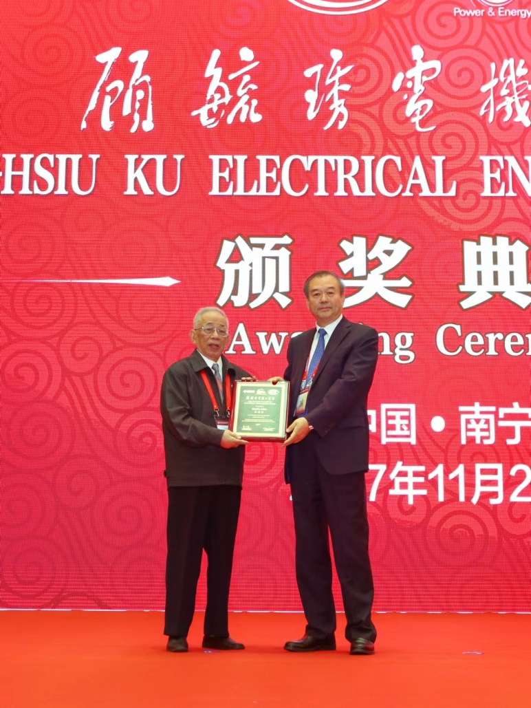 2017年11月24日中国电机工程学会郑宝森理事长为陈德树教授颁发“顾毓琇电机工程奖”