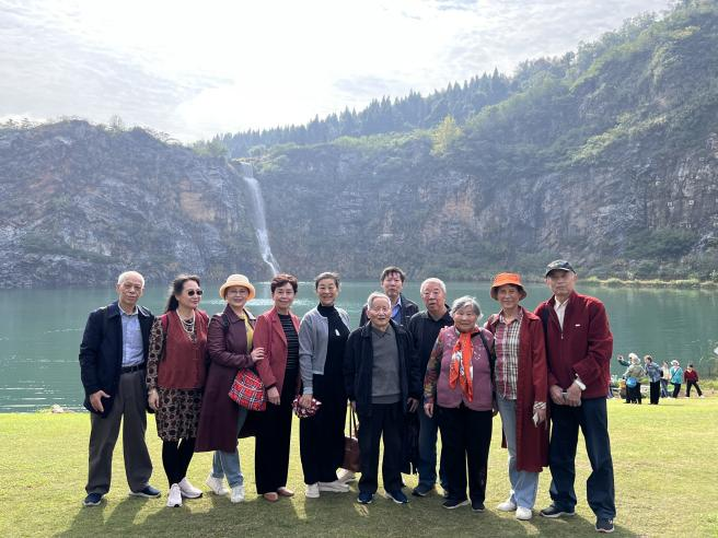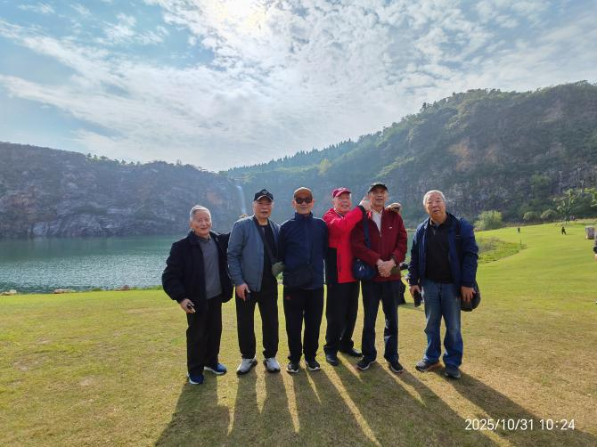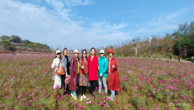退休教师们从公司集结出发,车行一路,笑语一车,温馨的笑谈中车外的景象由栉比鳞次的高楼大厦渐渐换成了田野的秋色,山谷的叠翠,上午十时进入了以矿业文化、农田景观为特色,发展多元生态产业,将废弃矿区打造成的灵山花境公园。“灵山花境”已被誉为武汉“稻城亚丁”,漫山遍野的花海与澄澈静谧的矿湖构成了一幅绝美的秋日画卷,老师们三五成群,沿着景区步道缓缓前行,呼吸着清新的山林空气,欣赏着由昔日矿山改造而成的生态美景,依次邂逅灵花水瀑、翡翠湖、矿野石林,一路尽览生态修复后的独特景致。山乡巨变,百闻不如一见,在花海中穿行老师们深切感受到了习近平总书记“绿水青山就是金山银山”的深远意义,在花海的深处,高山之巅50米高的瀑布近在眼前,壮丽的景观深深震撼着大家。景区内,七彩花田、高山草甸、复古步道、灵山古寺、矿坑湖泊等景观错落分布,构成了废弃矿山变身的生态画卷。在灵山花境打卡点处,瀑布从峭壁垂落,水流如银练,溅起的水花在阳光下闪着微光,与花海、山林相映成趣。老同志们或漫步花间,或驻足以瀑布为背景拍照,沉浸在如画山野中,“老有所乐”体现到了极致。