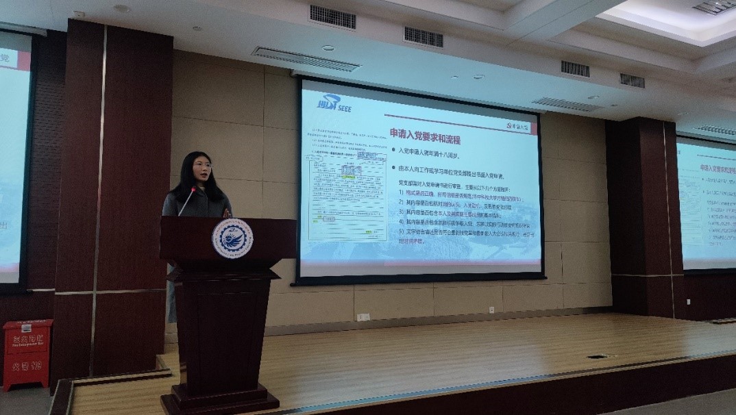 首先,电气硕士2105班党支部党支书楼奕轩同志首先就发展党员实务性工作进行了分享。党员发展是支部工作的重要内容,规范党员发展流程是党建工作的经常性、基础性课题。楼奕轩同志主要介绍了发展党员工作流程,涵盖申请入党、积极分子、发展对象确定及培养、预备党员接收及转正四个部分。楼奕轩同志强调了相关工作中注意事项,并指出党支书需增强工作责任感和使命感,熟练把握工作流程,把严格标准、严格培养、严格程序、严格责任贯穿在发展党员工作的全过程。