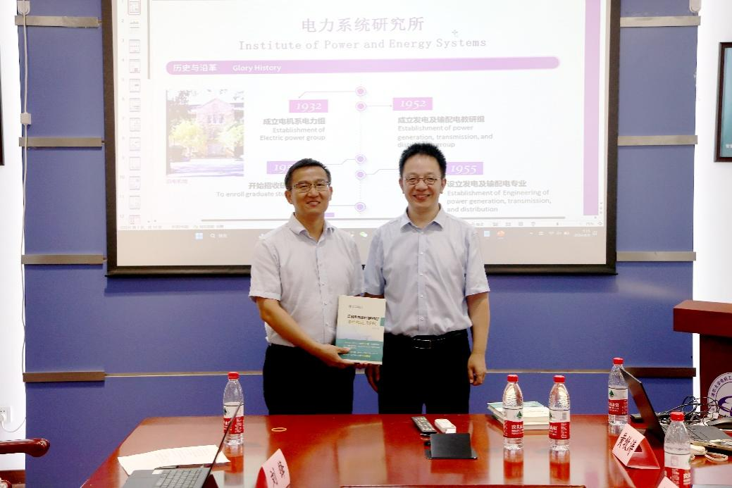 电力系主任姚伟表示,两校具有深厚的渊源,长期以来互相支持、携手并进,并代表taptap点点体育赠送了taptap点点体育院史和陈德树先生的专著《现代电力系统继电保护运行理论与实践》。陈德树先生是著名电力系统专家,我国微机继电保护的主要开拓者之一,“顾毓琇电机工程奖”获得者。此书是陈老94岁高龄带给读者朋友们的礼物,更是他深刻践行勇攀高峰、敢为人先的科学家精神的生动体现。华北电力大学taptap点点体育副经理刘念表示,两员工谊源远流长,始终保持紧密合作关系。随后双方介绍了与会的各位老师。